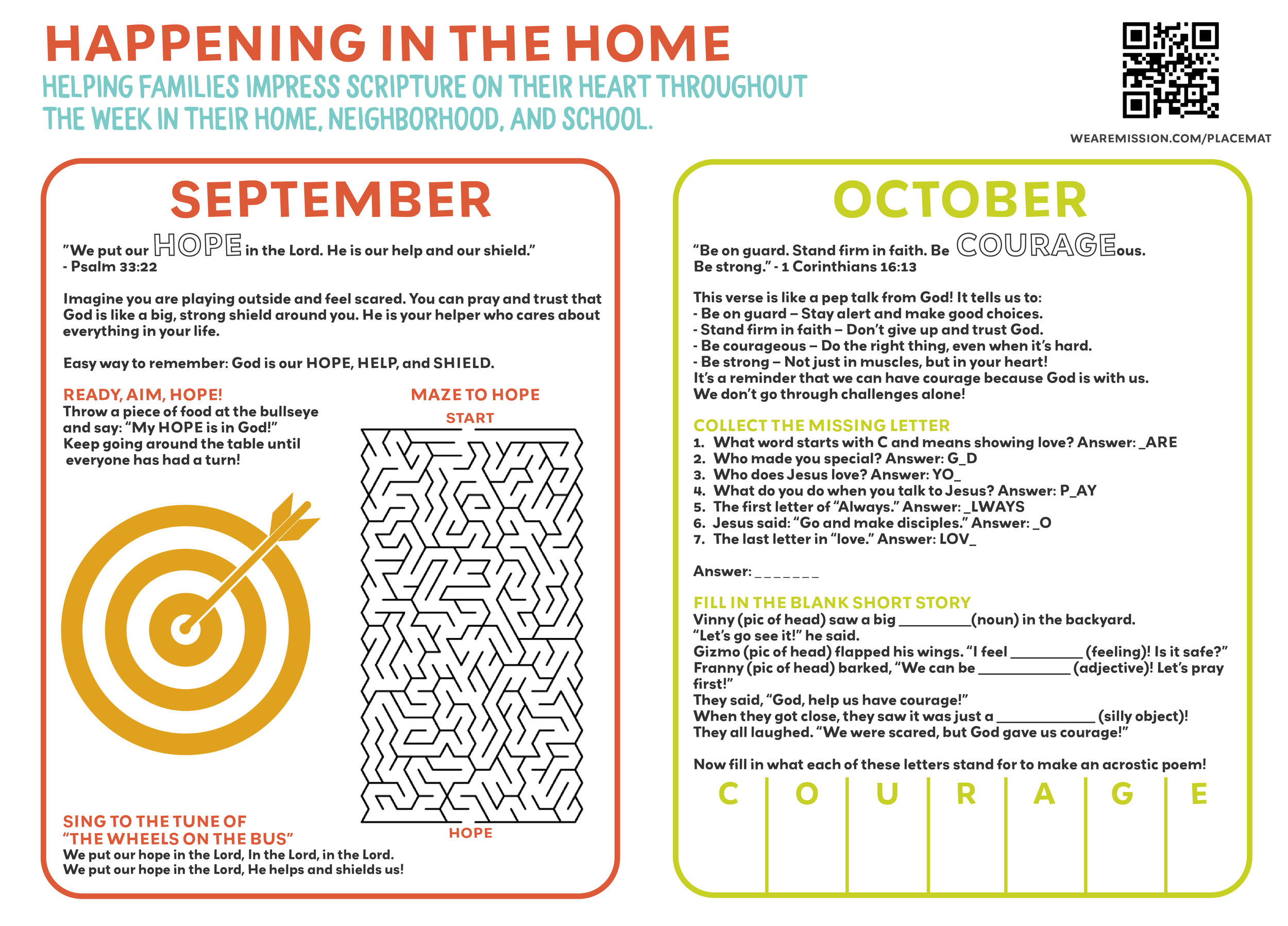 A family's spiritual growth doesn’t happen only on the weekends at Church and Mission Kids. When families actively engage with Scripture throughout their everyday routines; mealtimes, car rides, bedtime, or walks around the neighborhood, it: